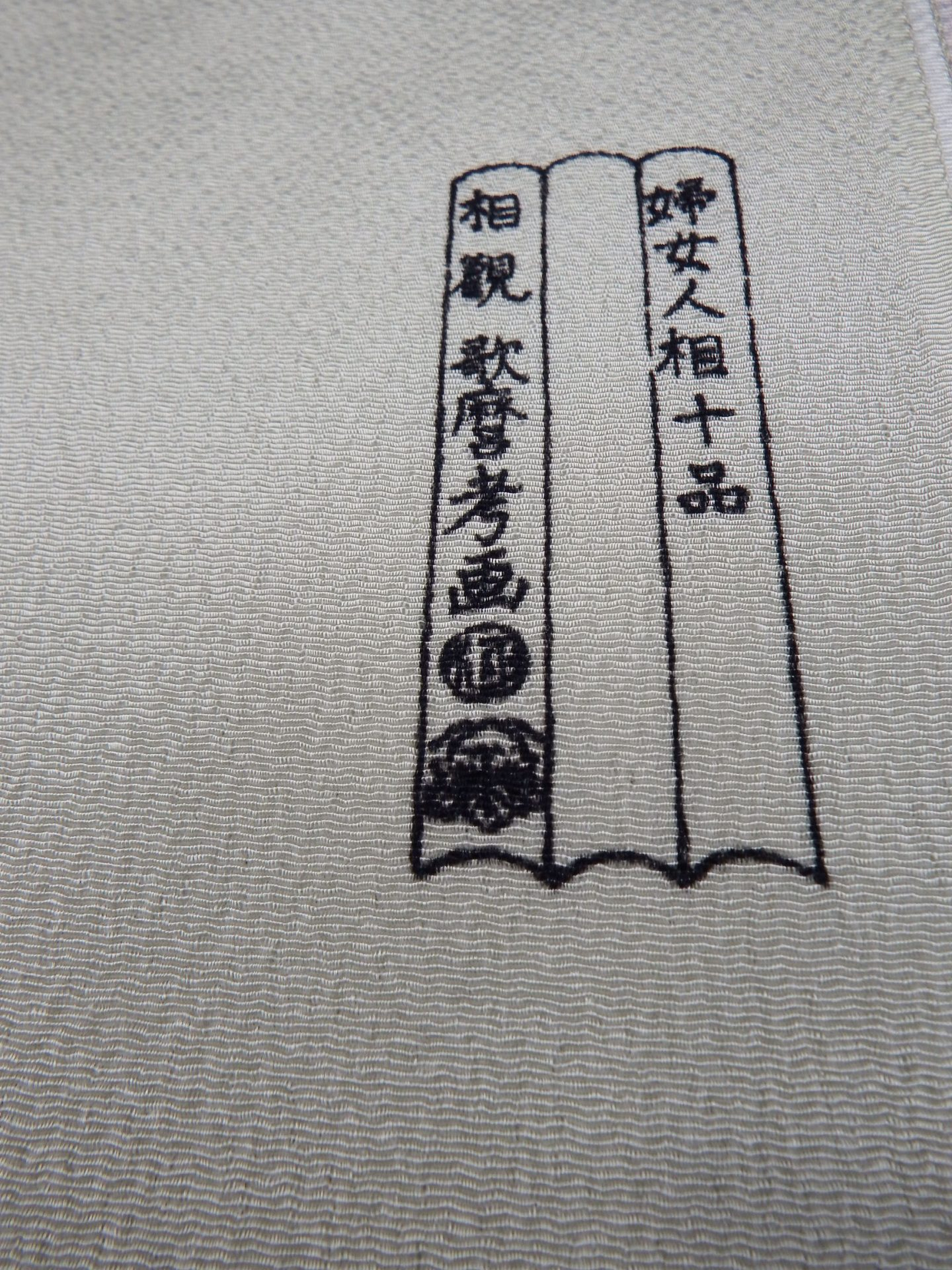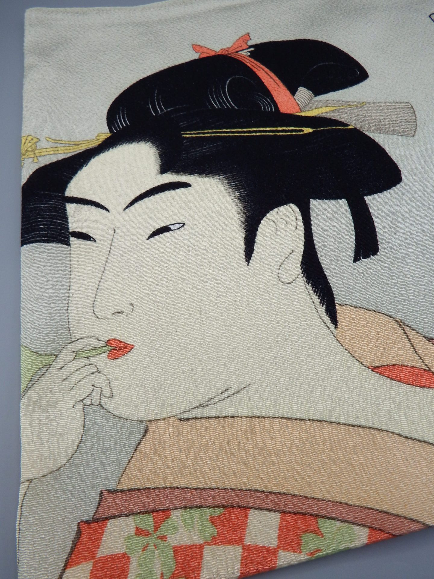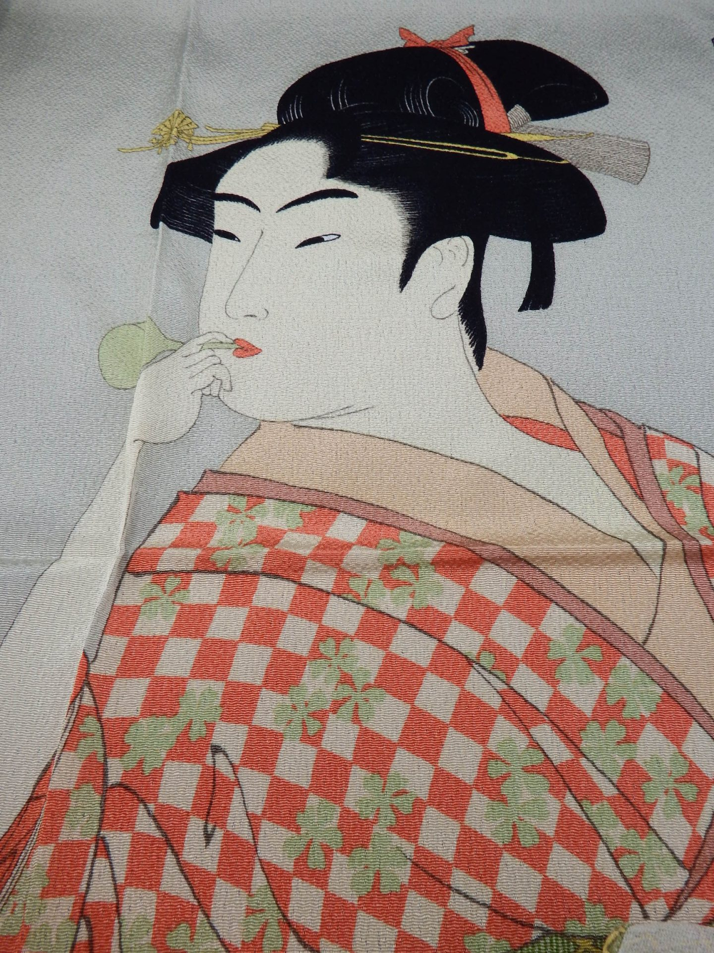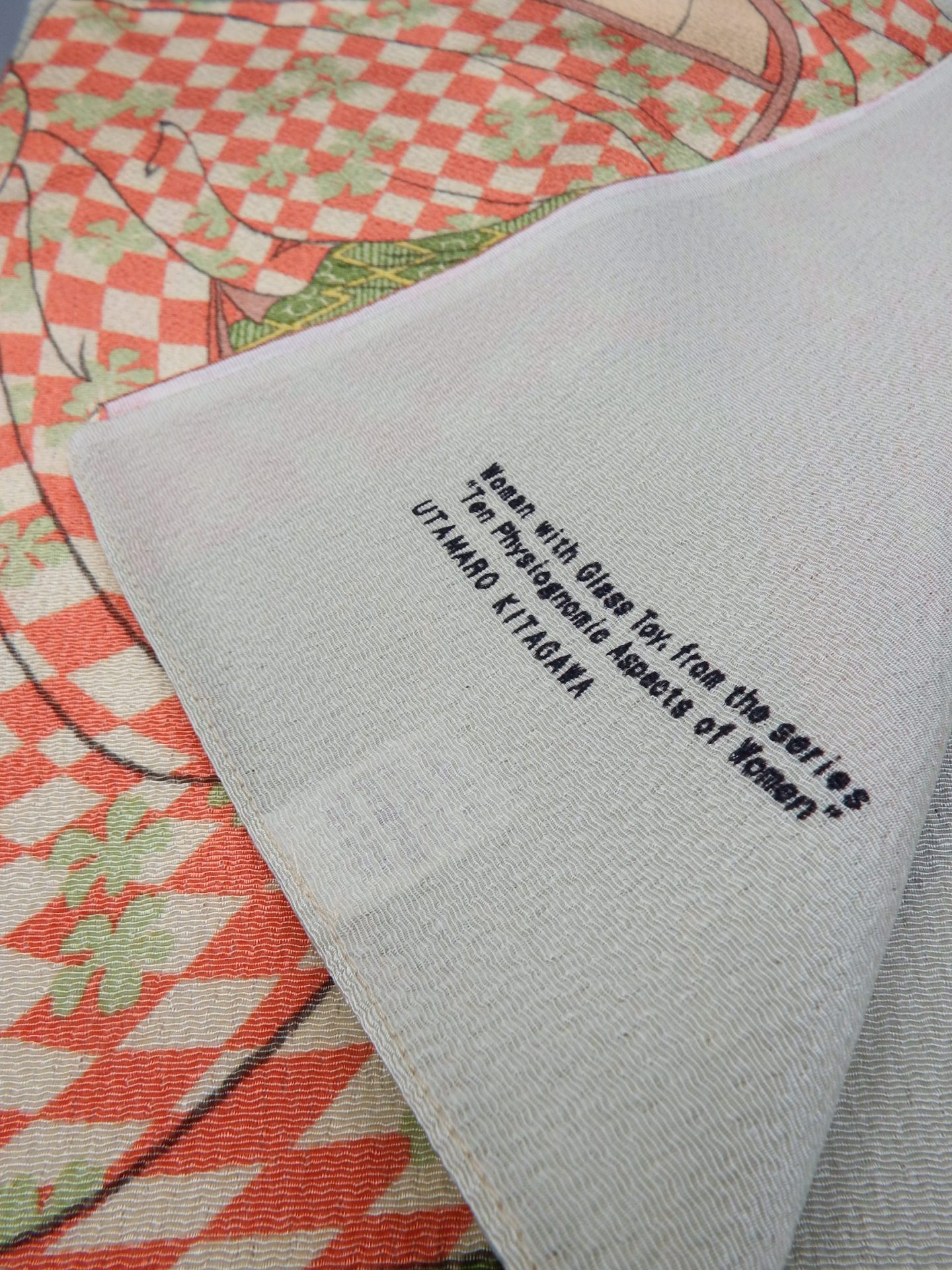 Questo furoshiki prodotto in Giappone da YAMADA SENI è uno dei capolavori di Utamaro. Una giovane donna si diverte con un piccolo giocattolo d’erba: lo sta soffiando per produrre il caratteristico suono “scoppiettante”. Il kimono, con motivo a scacchi rosso vivo, è assolutamente sublime.