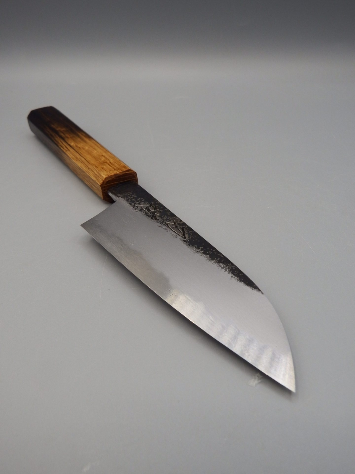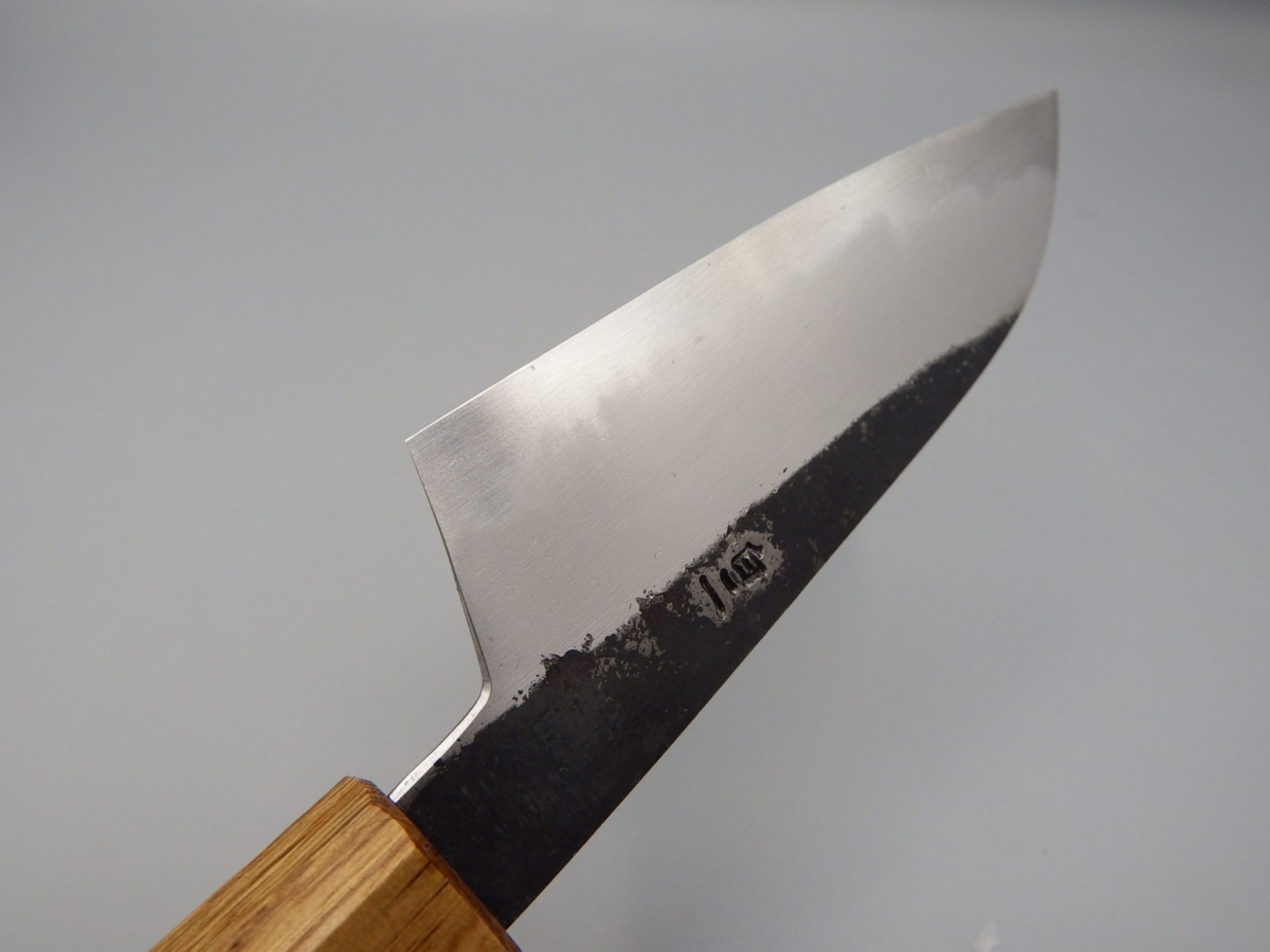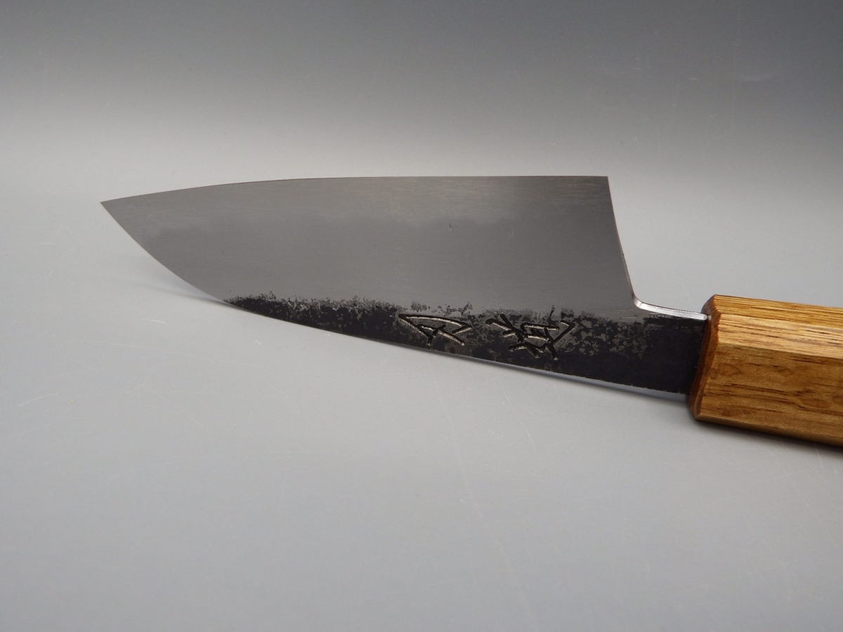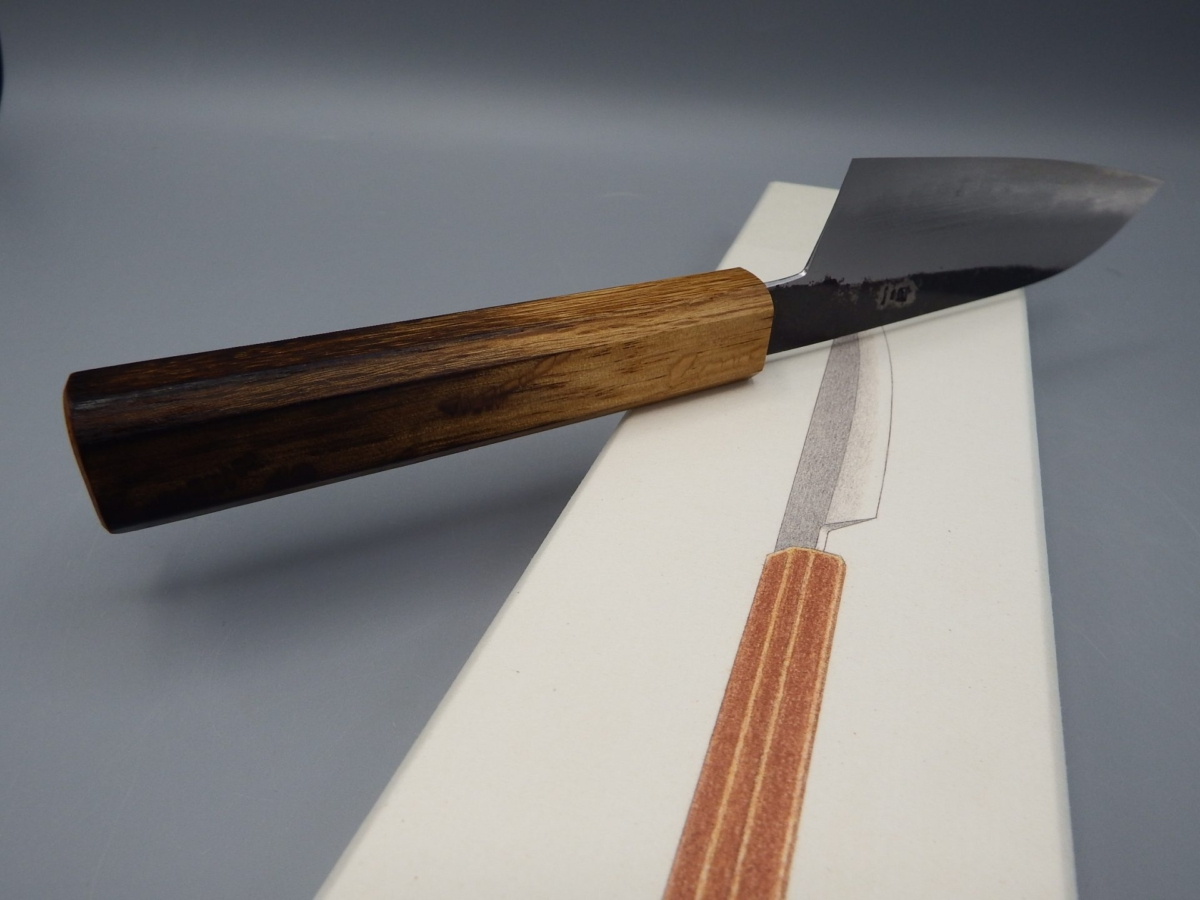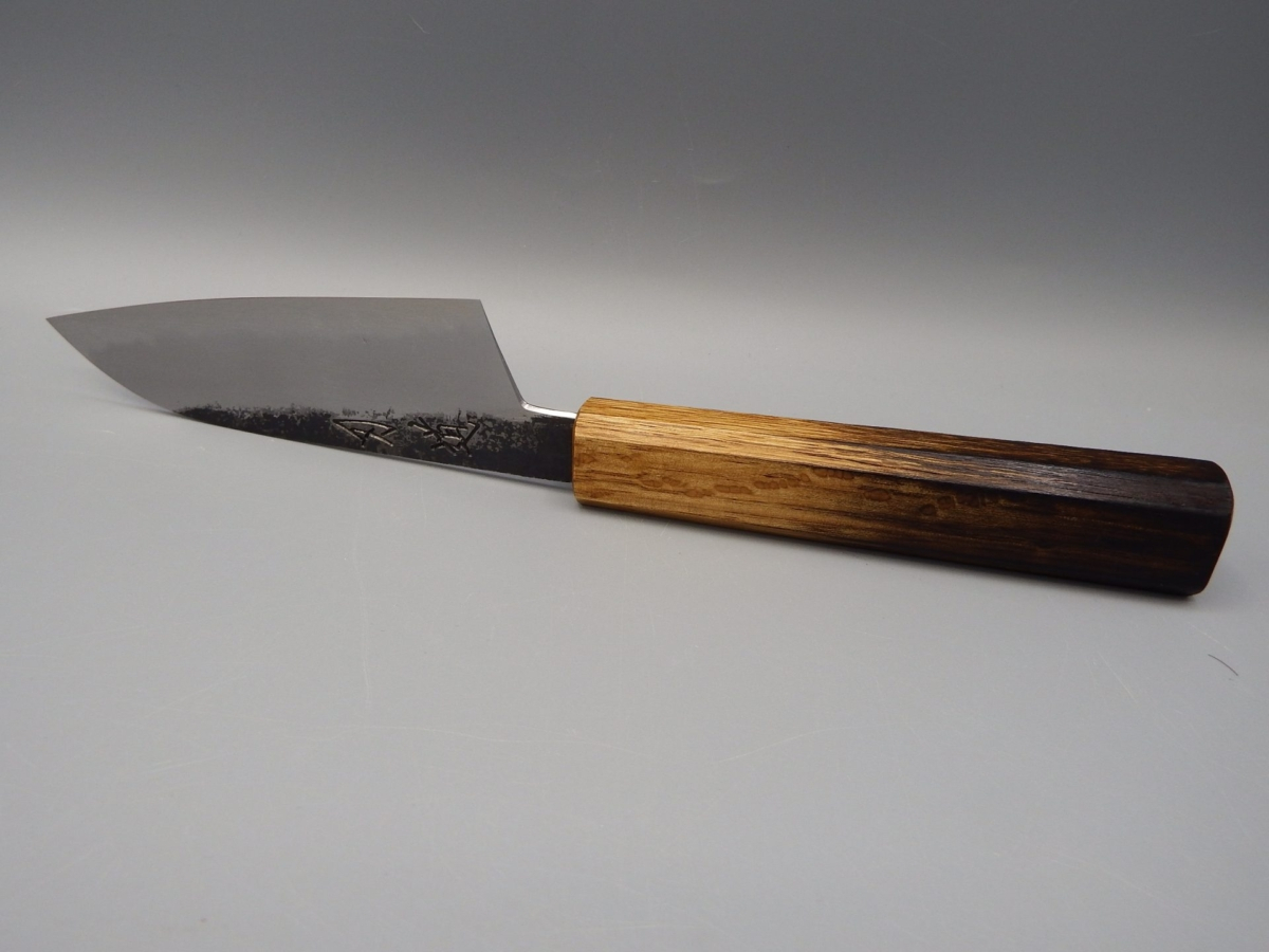 Sumi (墨) si traduce come “inchiostro nero”, in riferimento alla finitura kurouchi (annerita) che si sovrappone ad una splendida finitura kasumi. L’affilatore, Maruyama Tadataka san, ha realizzato un contrasto particolarmente raffinato tra ferro dolce (Jigane) e acciaio ad alto contenuto di carbonio (Hagane). Il manico, in legno di quercia, è stato trattato con una tecnica tradizionale giapponese che si chiama Yaki Sugi (焼杉): il legno viene parzialmente bruciato, per aumentarne la resistenza ma soprattutto, in questo caso, per ottenere un aspetto particolarmente accattivante.
