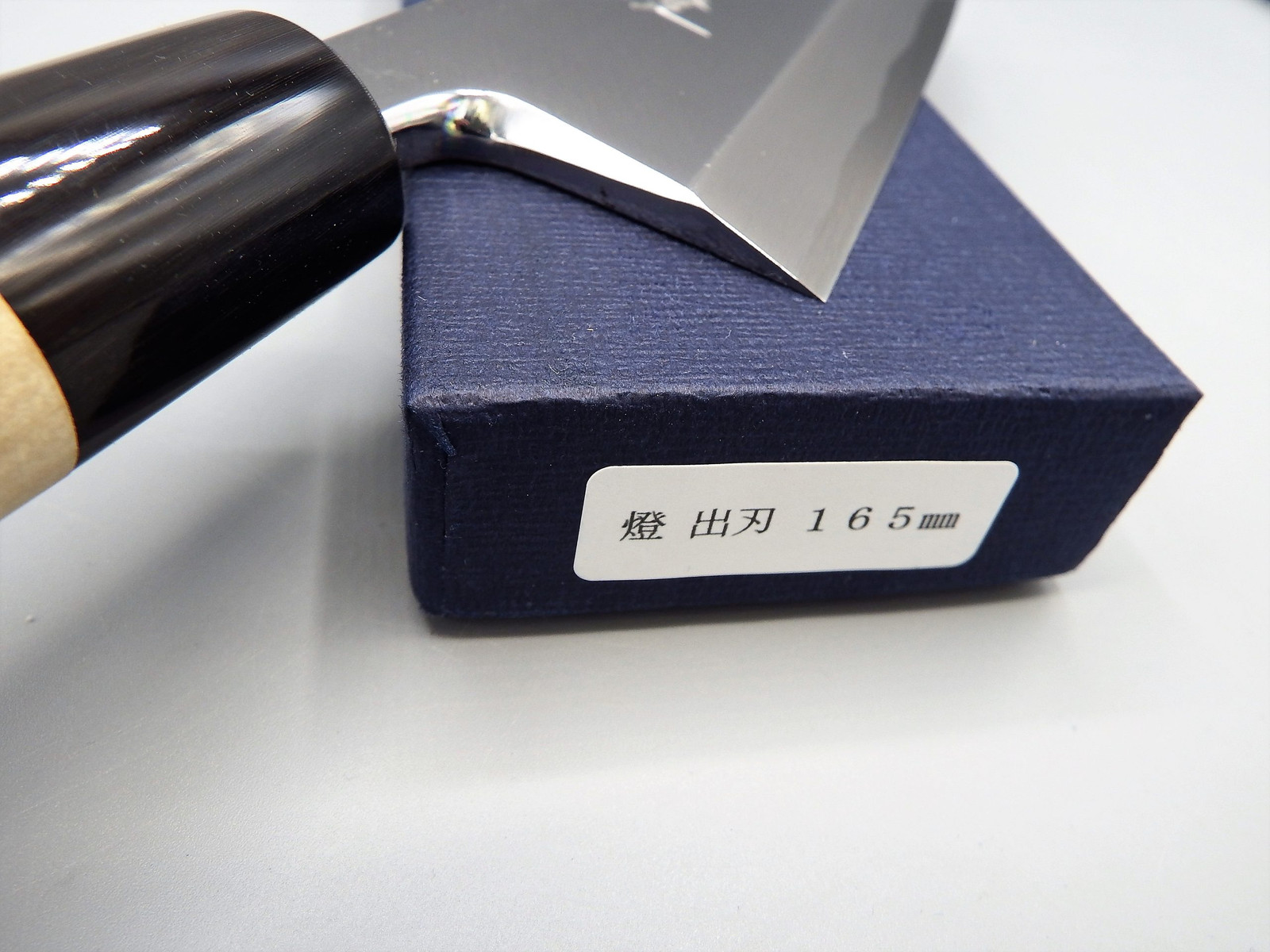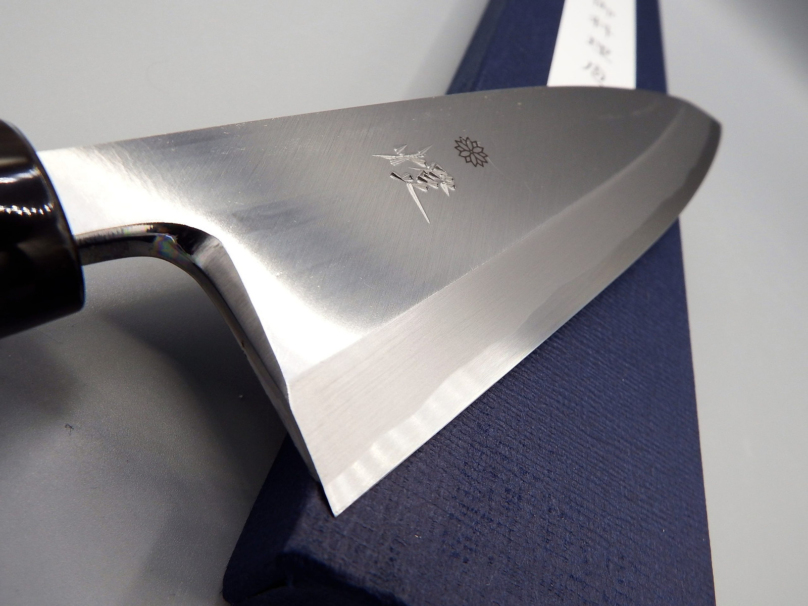 Le lame portano il kanji TOMOSHIBI e il crisantemo stilizzato simbolo di Sakai Kikumori. Tomoshibi si traduce come “candela che illumina”. Sakai Kikumori spera che il cibo cucinato con questi coltelli illumini la casa.