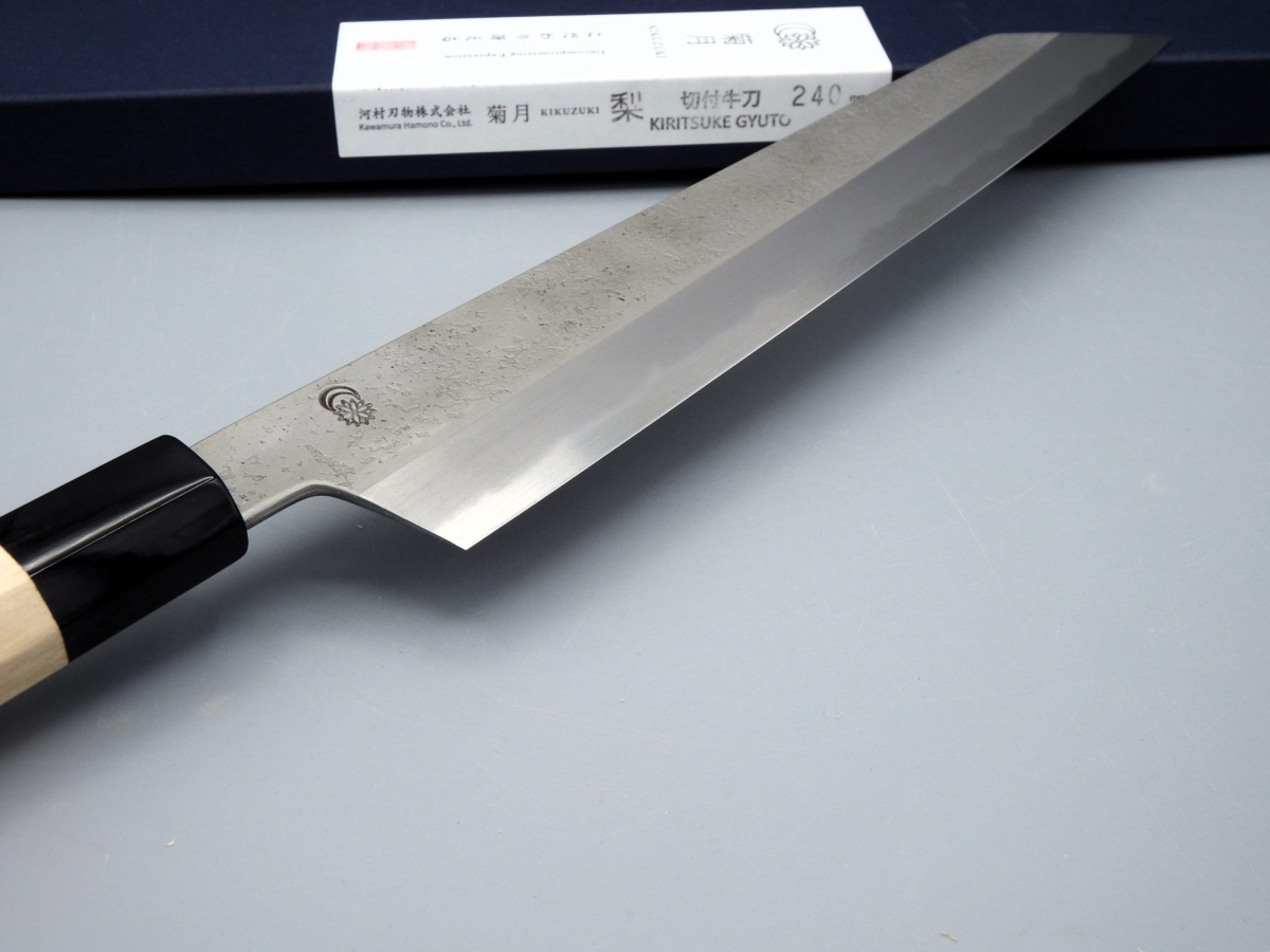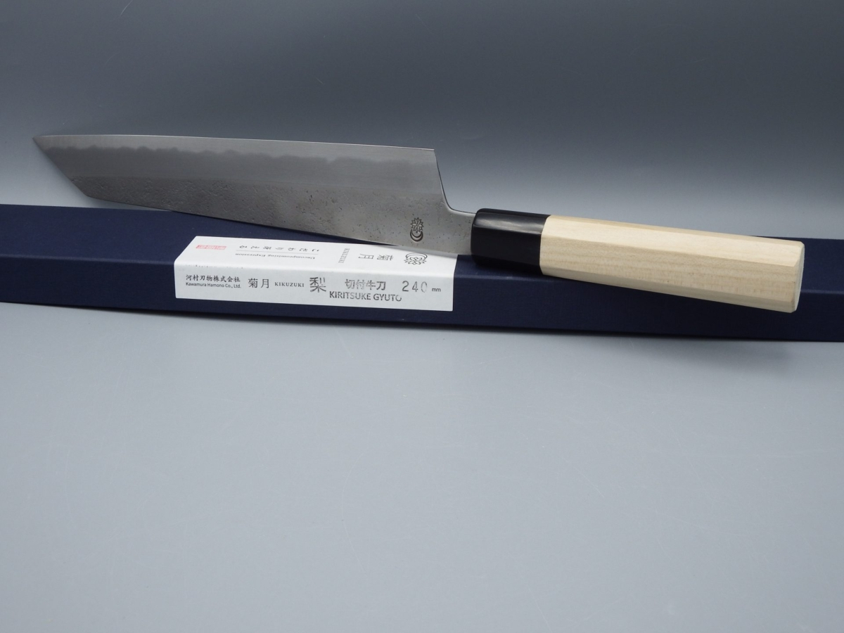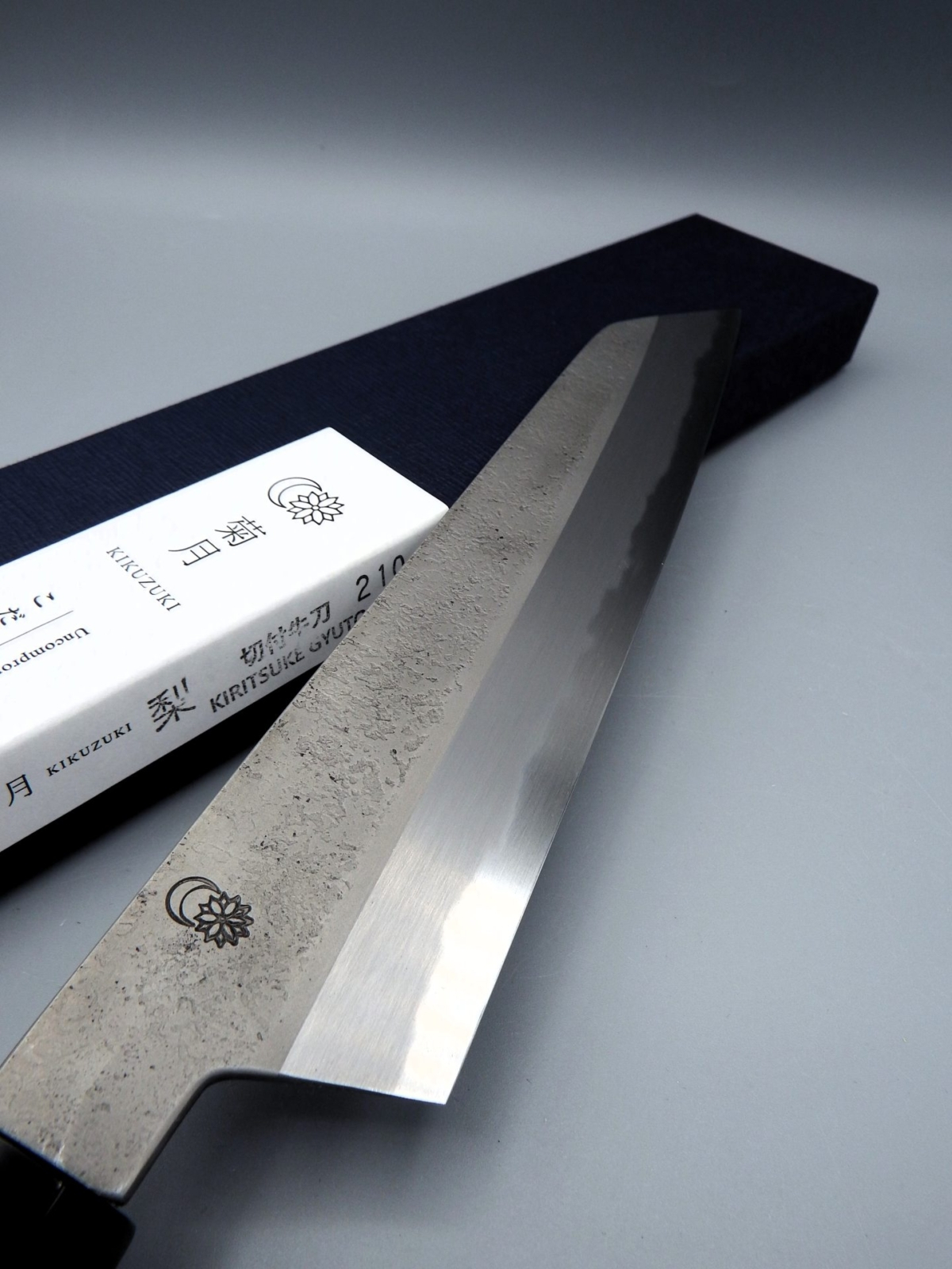 Sakai Kikumori personalizza questo classico stile di finitura con una lucidatura leggera, che conferisce alla lama un aspetto luminoso e cangiante. Alla mano, questi coltelli sono solidi e robusti, ma, fin dal primo taglio, emerge la proverbiale maneggevolezza dei coltelli forgiati di Sakai. Tutti i coltelli di questa serie sono muniti di fodero protettivo in legno di magnolia (Saya in giapponese). Quì è possibile vedere la serie Kikuzuki e Kikuzuki Rin al completo.