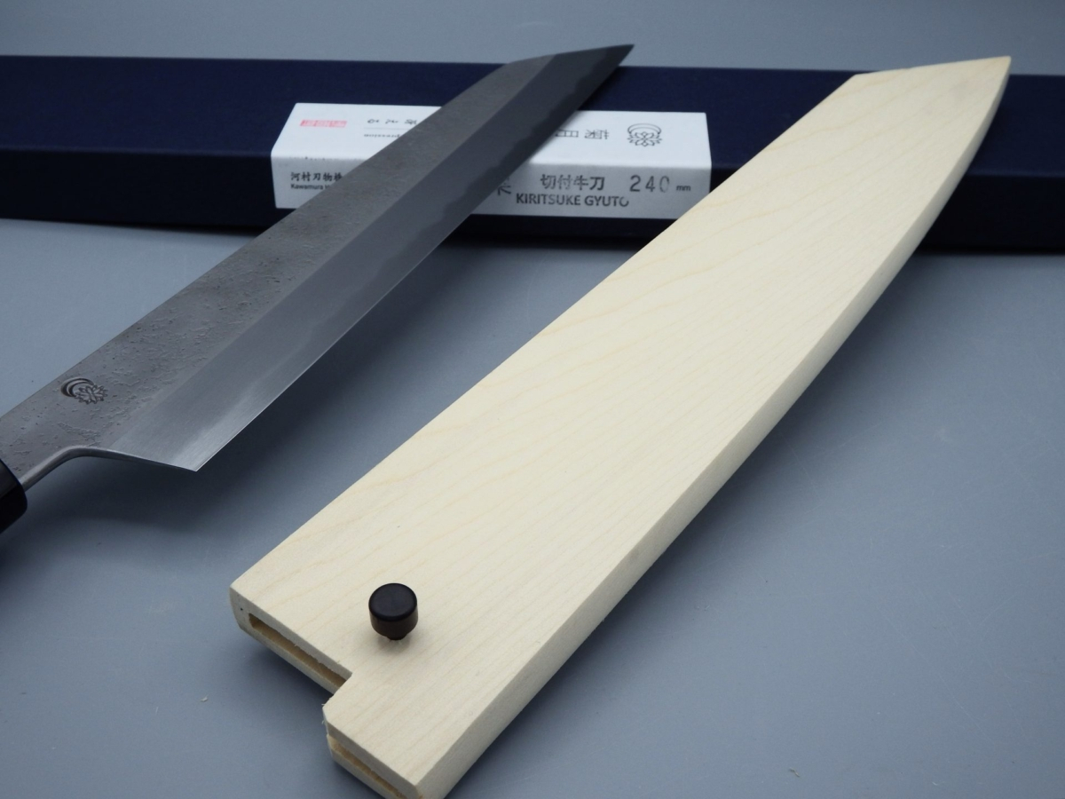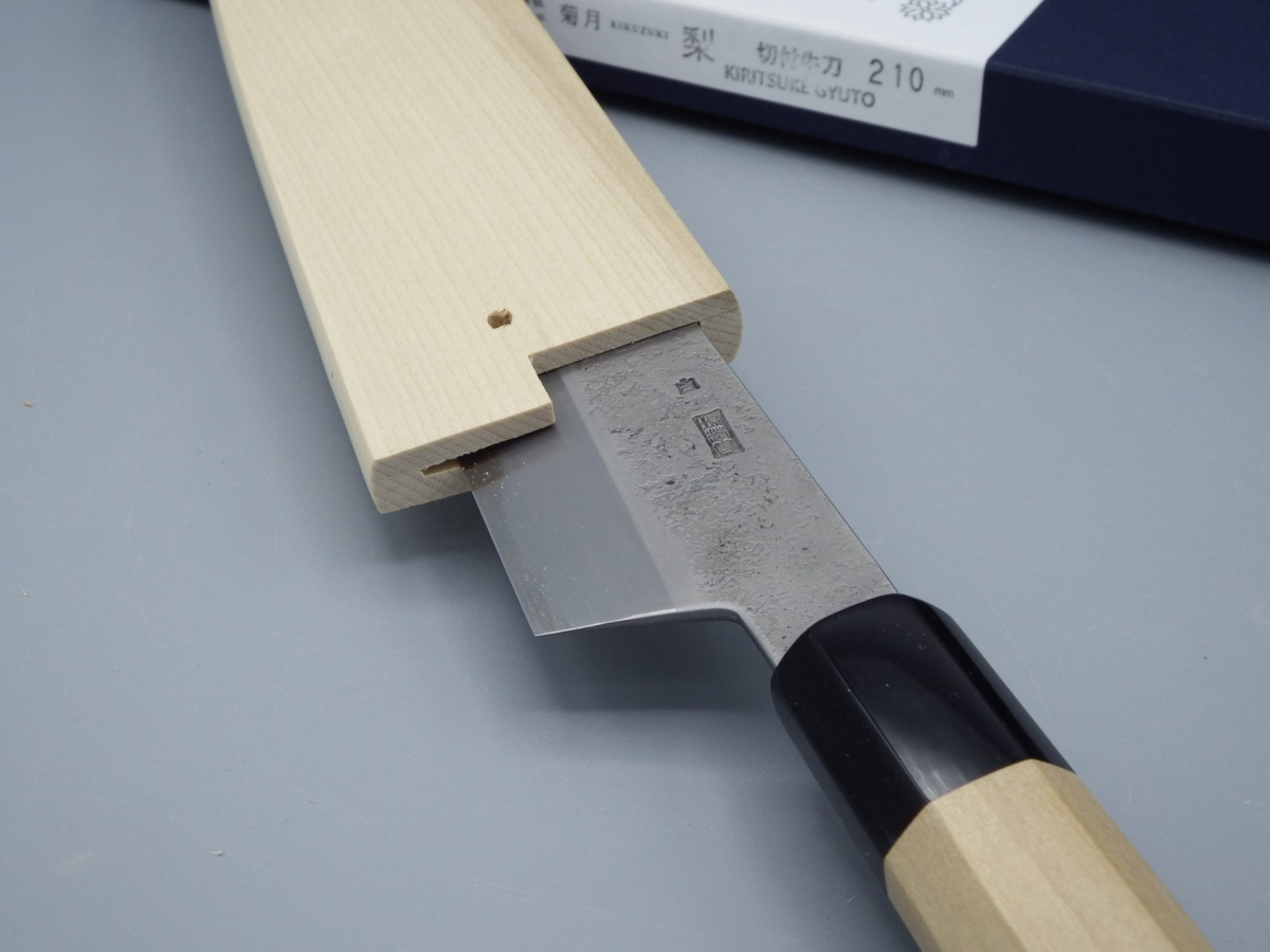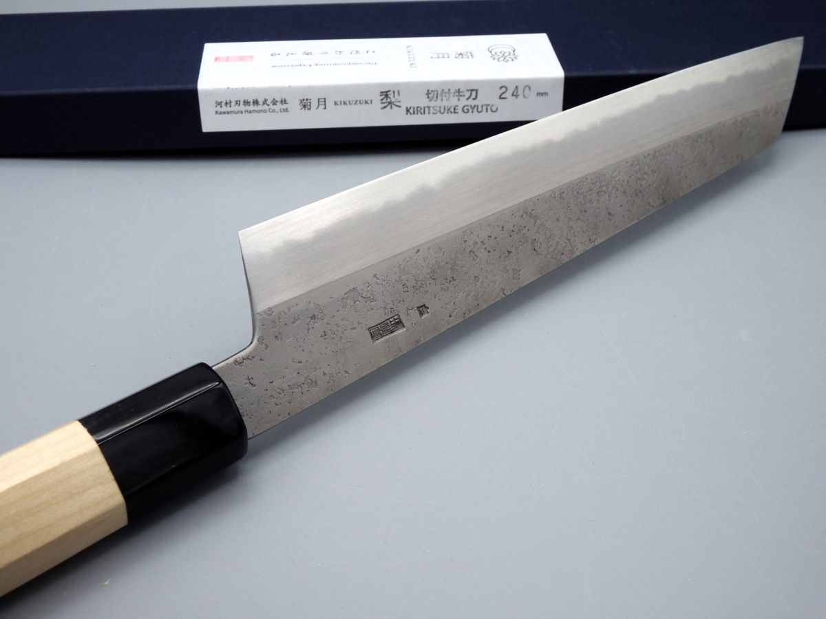 Sakai Kikumori personalizza questo classico stile di finitura con una lucidatura leggera, che conferisce alla lama un aspetto luminoso e cangiante. Alla mano, questi coltelli sono solidi e robusti, ma, fin dal primo taglio, emerge la proverbiale maneggevolezza dei coltelli forgiati di Sakai. Tutti i coltelli di questa serie sono muniti di fodero protettivo in legno di magnolia (Saya in giapponese). Quì è possibile vedere la serie Kikuzuki e Kikuzuki Rin al completo.