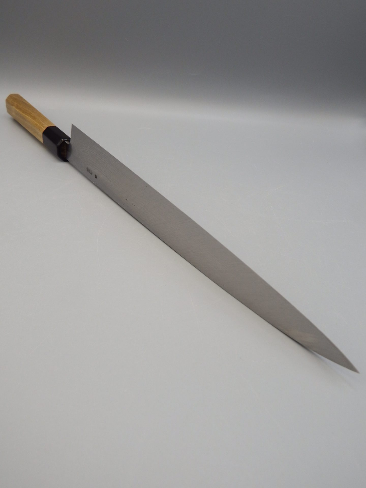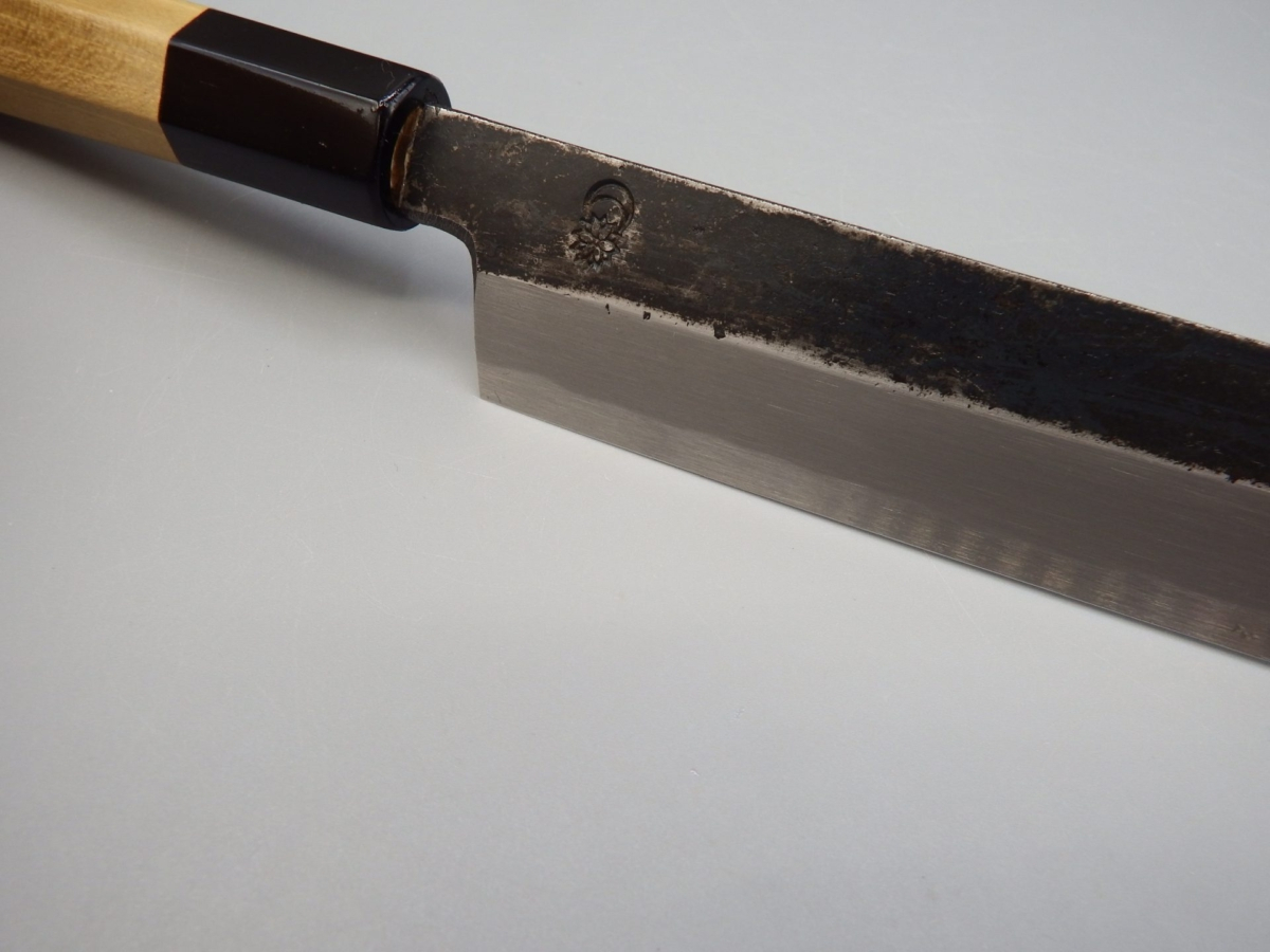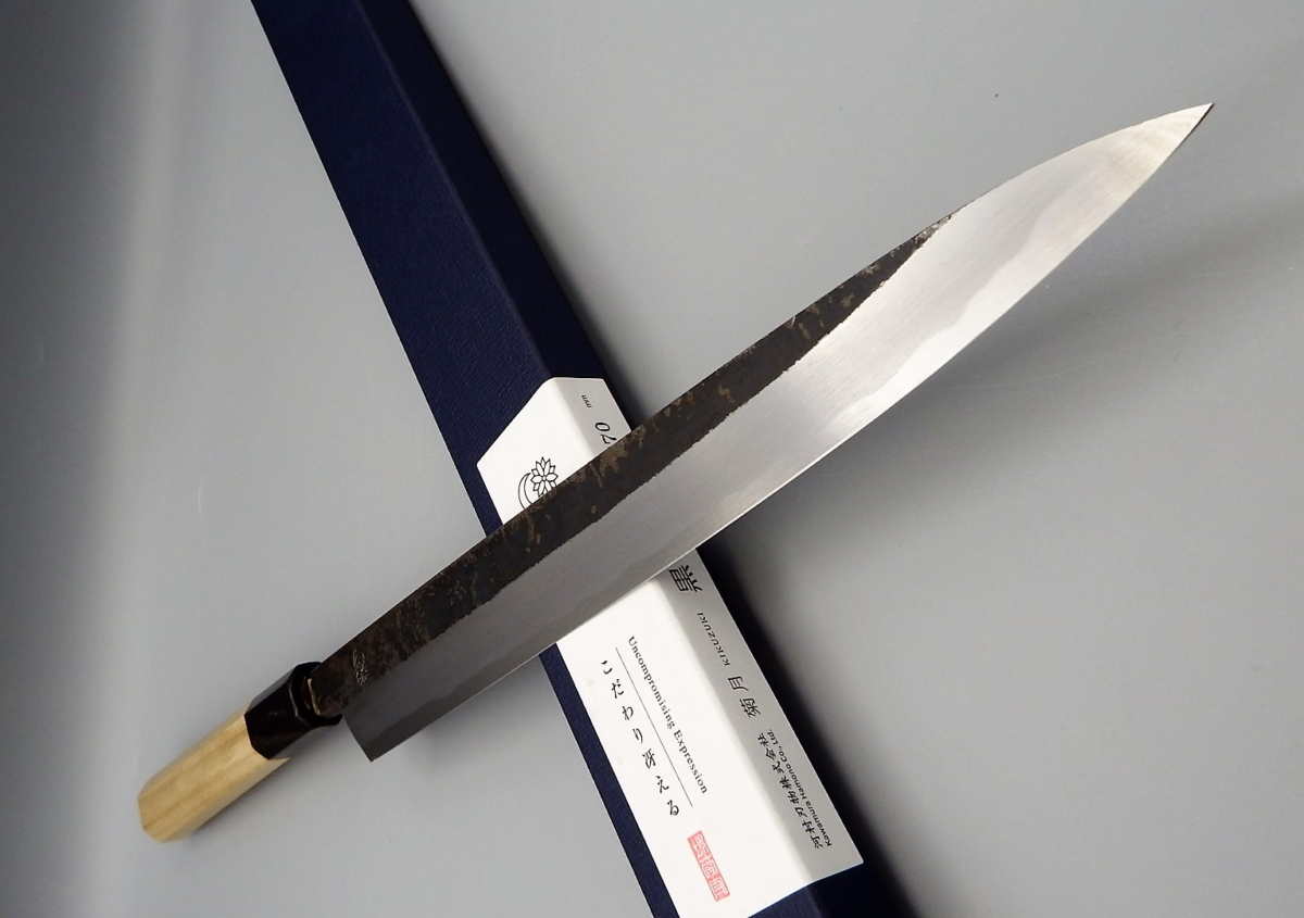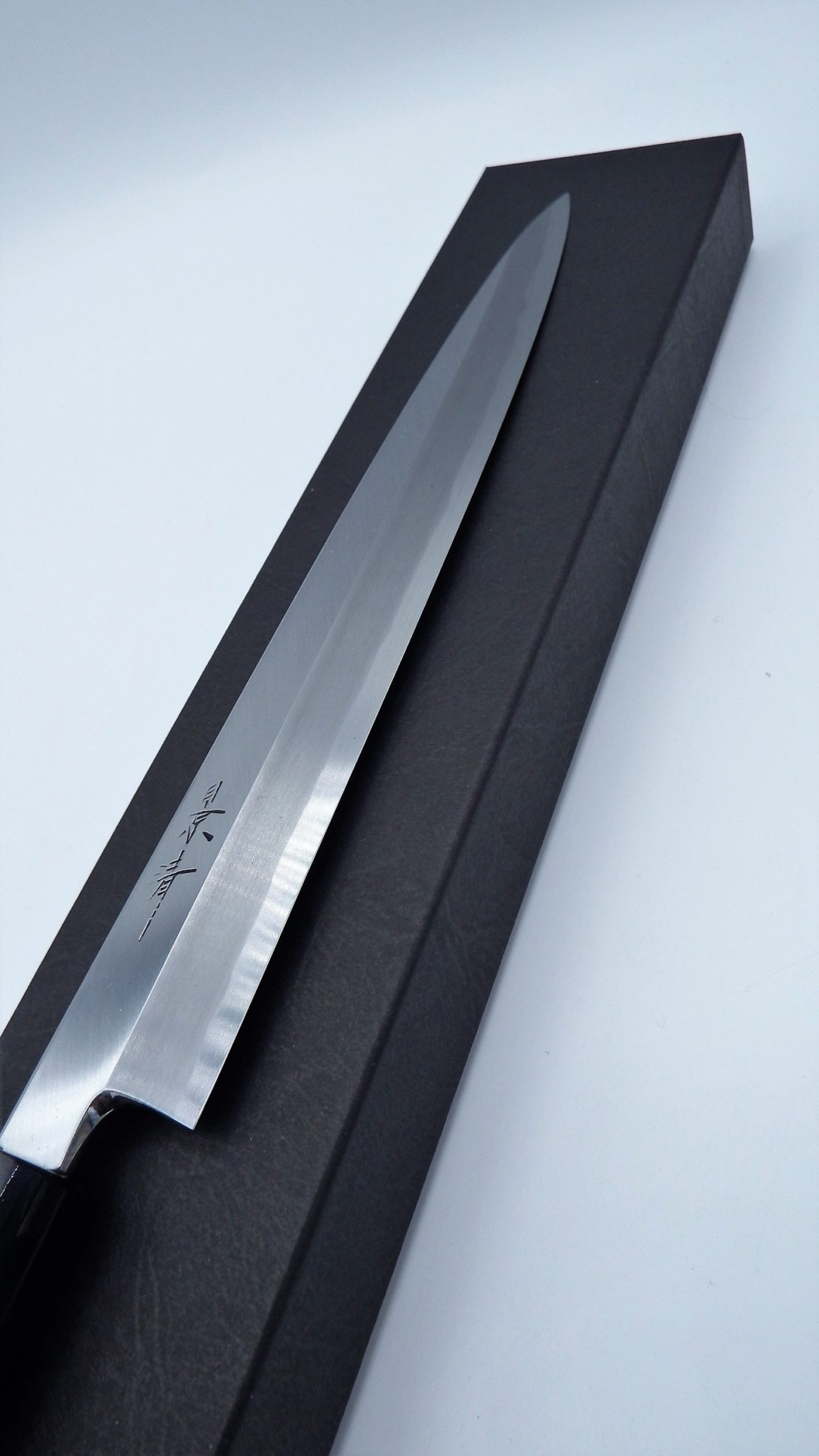 Brand: Sakai Kikumori ComparaLo Yanagiba, probabilmente, è il coltello tradizionale giapponese più conosciuto. Dedicato a preparazioni quali sushi e sashimi, è molto adatto al taglio dei filetti di pesce. Si trova praticamente in tutte le cucine professionali giapponesi, ma anche nelle case, in versioni più economiche. Ha una lama lunga e appuntita, che lo rende ideale per tagliare il pesce in un unico taglio continuo. Questo particolare taglio dona alla superficie del pesce un aspetto particolarmente lucido ed accattivante. Presa confidenza con questo coltello è possibile utilizzarlo anche per altri compiti come per esempio sbucciare le verdure, eseguire tagli alla julienne, ecc.