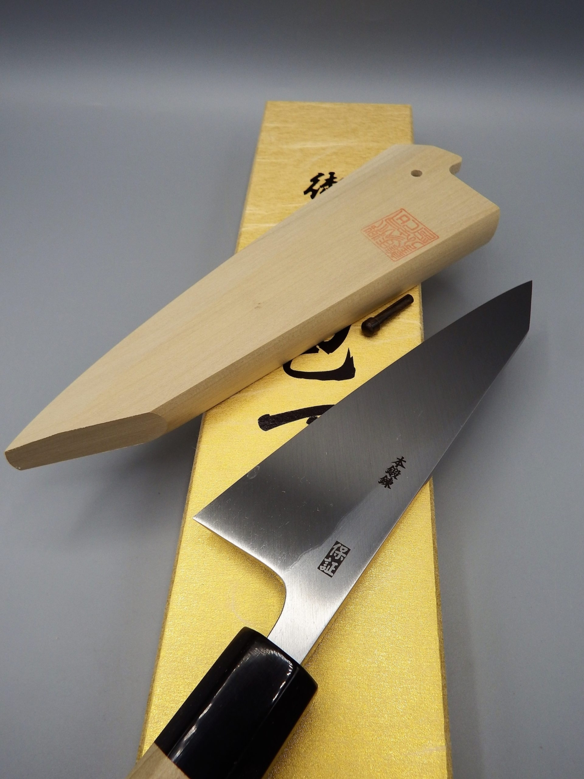 La finitura in stile kurouchi rende questi coltelli meno sensibili all’ossidazione rispetto alla versione lucidata (migaki). Nonostante questo, si raccomanda di tenerli puliti durante l’utilizzo (con una spugna o panno umido) e di asciugarli accuratamente, prima di riporli, a fine lavoro. Il coltello è dotato di fodero in legno di magnolia (saya in giapponese).