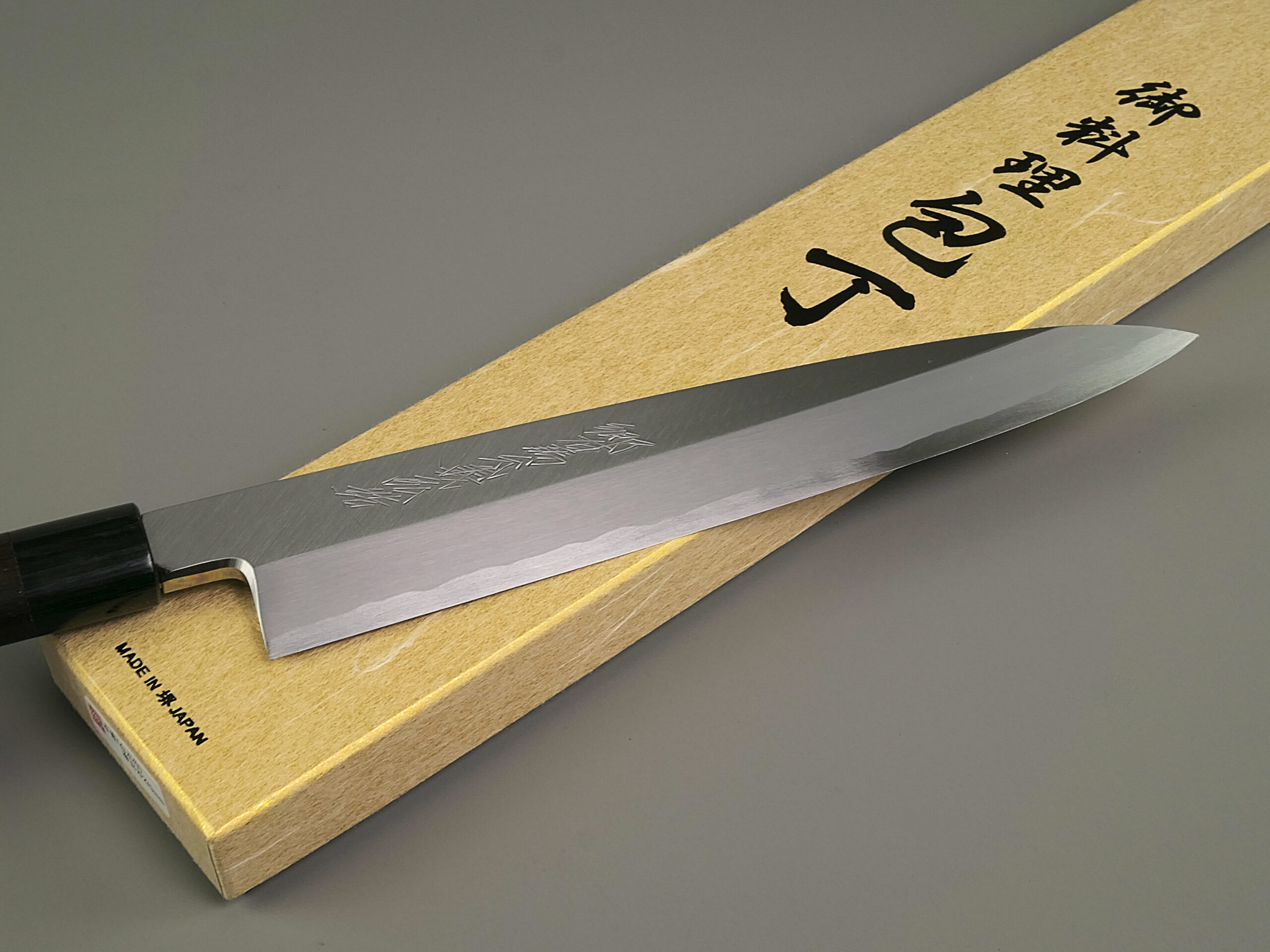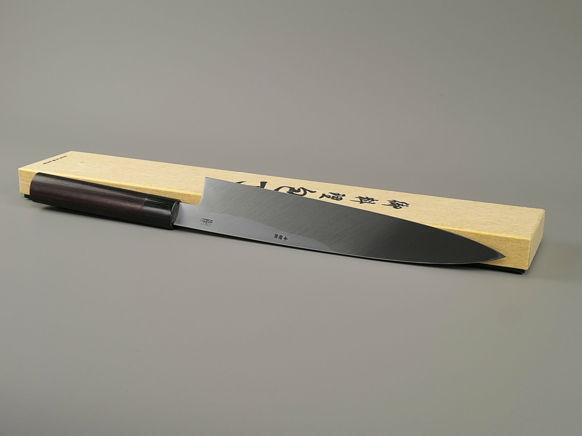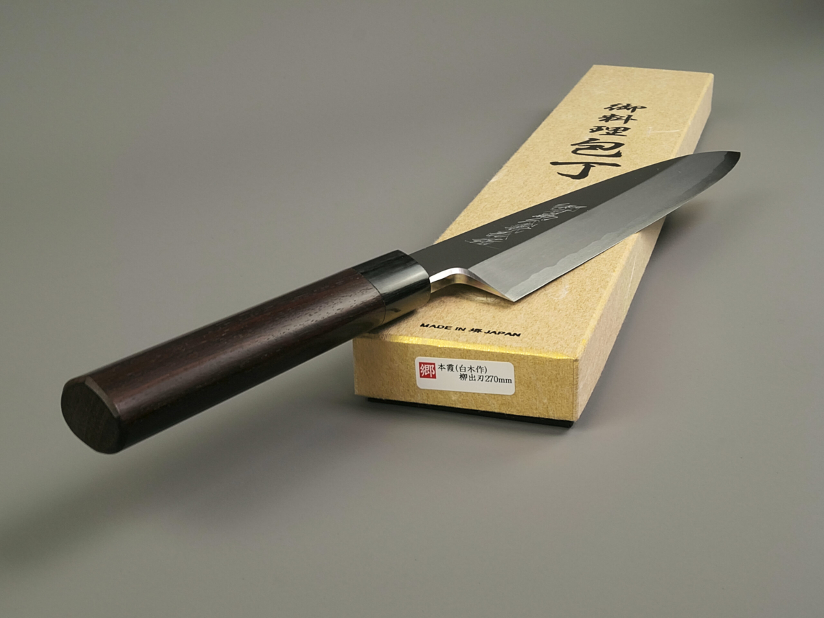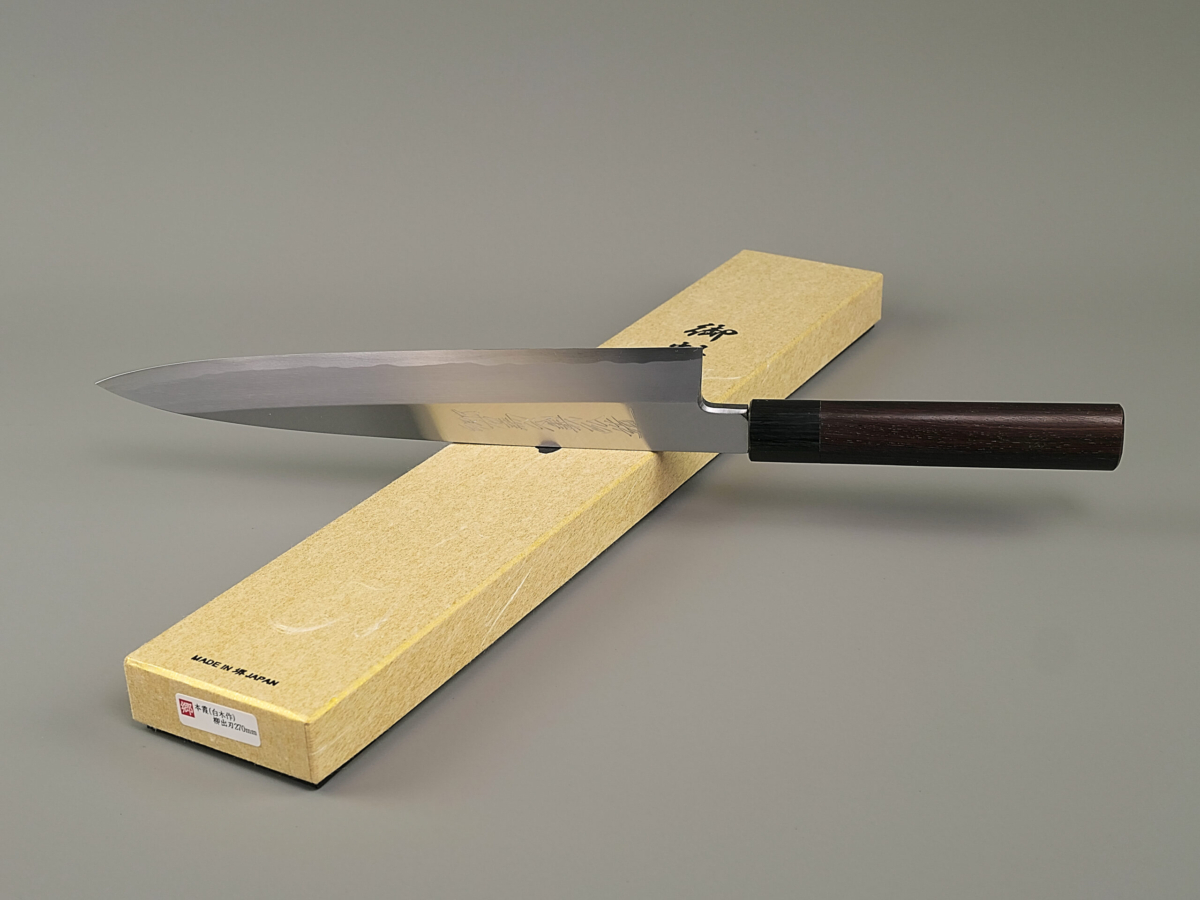 La misura 270 mm è stata forgiata molti anni fa dal famoso fabbro Kenichi Shiraki, ora non più in attività. Da alcuni anni infatti, ha passato il testimone al suo apprendista Satoshi Nakagawa, oggi ritenuto il giovane fabbro più promettente di Sakai. Yoshihiro ha affilato questi due esemplari in esclusiva per Steelinkitchen.